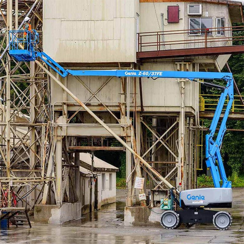 Las plataformas articuladas con motor diésel GENIE modelo Z-60 aportan una altura de trabajo de 20 metros, con un alcance horizontal que llega a los 11 metros. La carga máxima es de 227 Kg. La longitud de transporte de la máquina es de 8,15 metros, presenta un ancho de 2,46 metros y la altura replegada 2,69 metros.